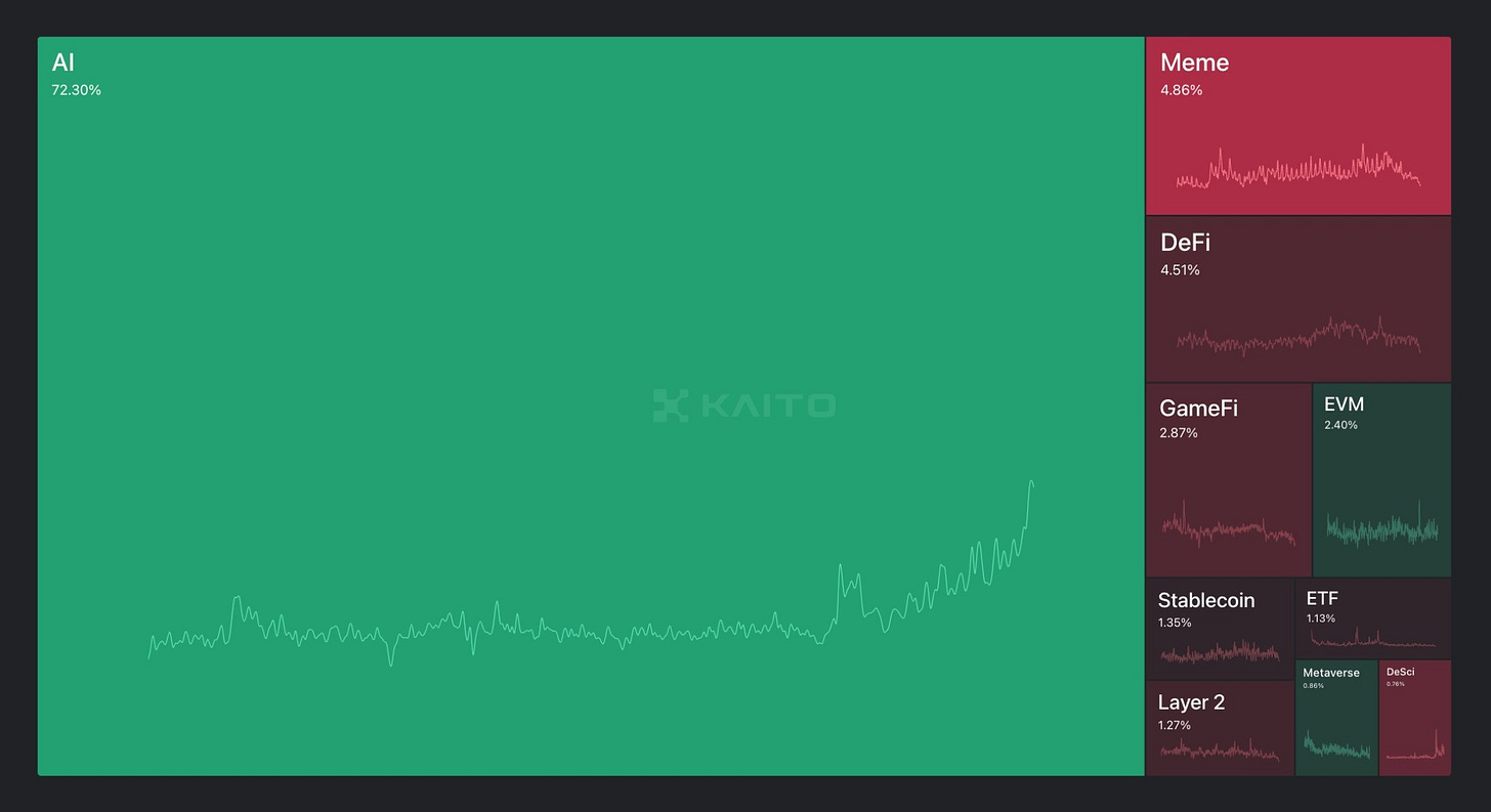 Ever since the mass introduction of ChatGPT, AI (Artificial Intelligence) has taken the world by storm. News headlines displayed a mixed sentiment, “AI is replacing human tasks faster than you think” or “5 Reasons You Should Love AI”. On CT (Crypto Twitter), it’s clear that AI has emerged triumphant. AI mindshare has reached all-time highs, taking over long-standing verticles like memecoins and DeFi. This article will focus on how AI works and the opportunities that serve AI in the space.
